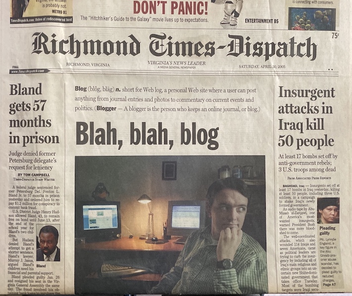 Throw-back: that one time on April 30, 2005 that I was on the front page of the Richmond Times-Dispatch for blogging. Nearly 15 years ago.