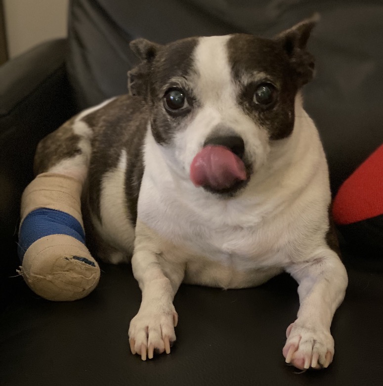 This is the ones of ours that has been having to get his bandages changed throughout all of this. He had a tumor on the back of his leg that had to be removed. We were told that next Monday he might get to have the bandage removed which would make us very happy.