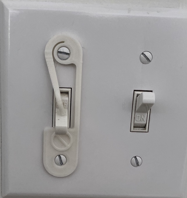 Another functional thing I printed was a light switch lock. I put it on this switch just as an example of how it works. But generally, the idea is you can put it on in either direction depending on whether you want to keep a switch on or off. It can be easily bent out of the way if you do need to flip the switch (I apparently need to clean this switch …):